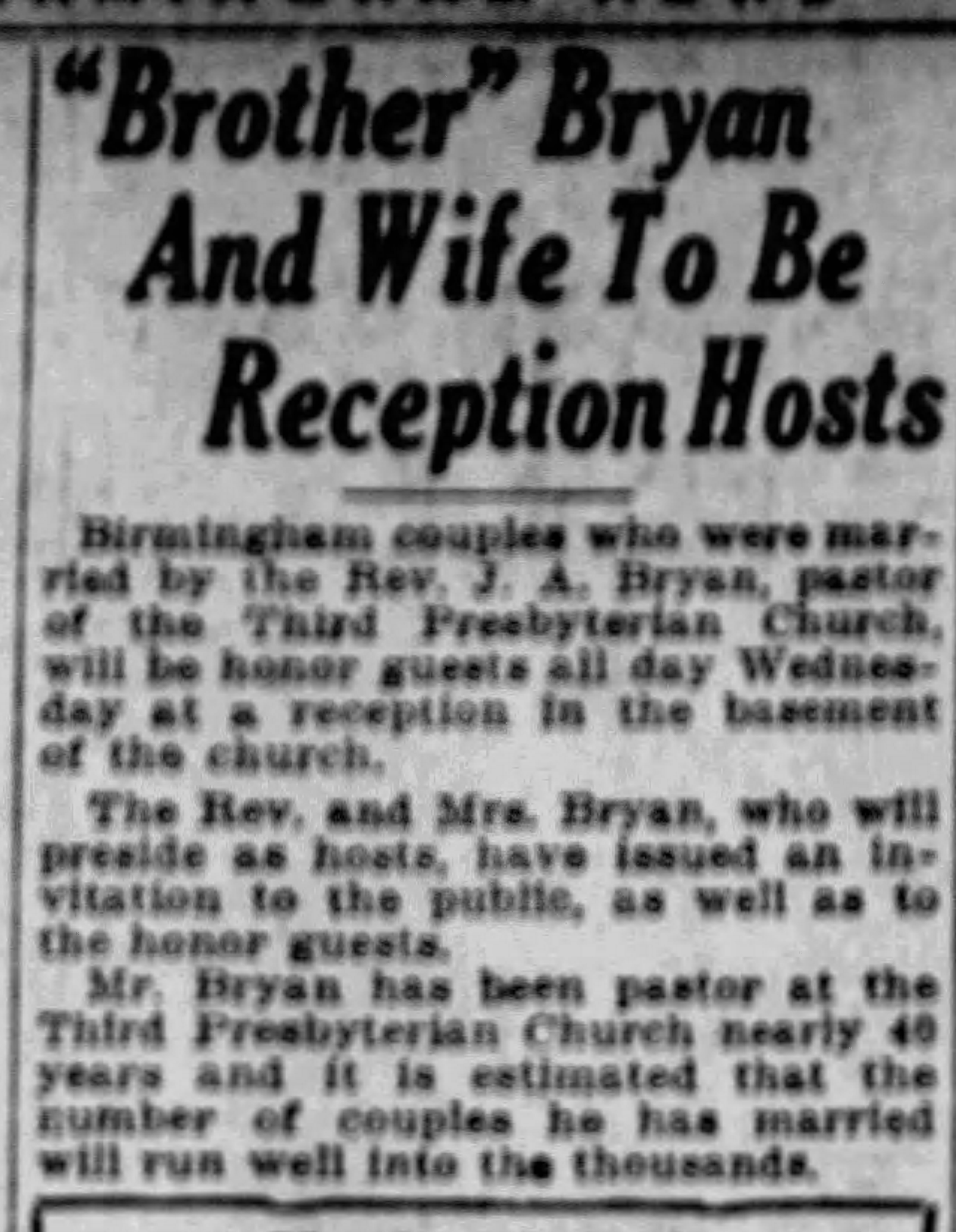 “Brother” Bryan and Wife To Be Hosts At Reception from Birmingham News on 1926-12-28