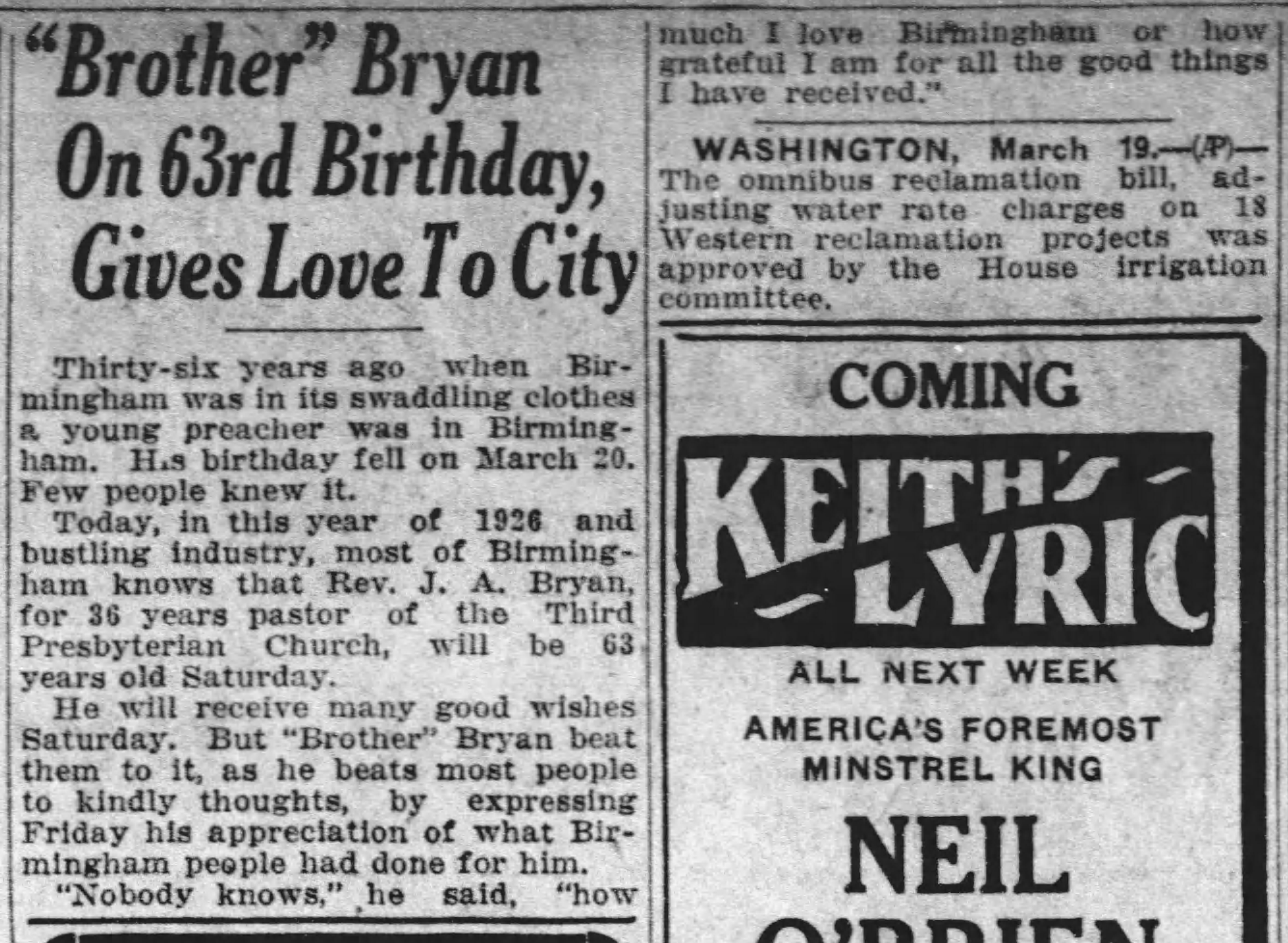 “Brother” Bryan On 63rd Birthday Gives Love To The City from Birmingham News on 1926-03-19