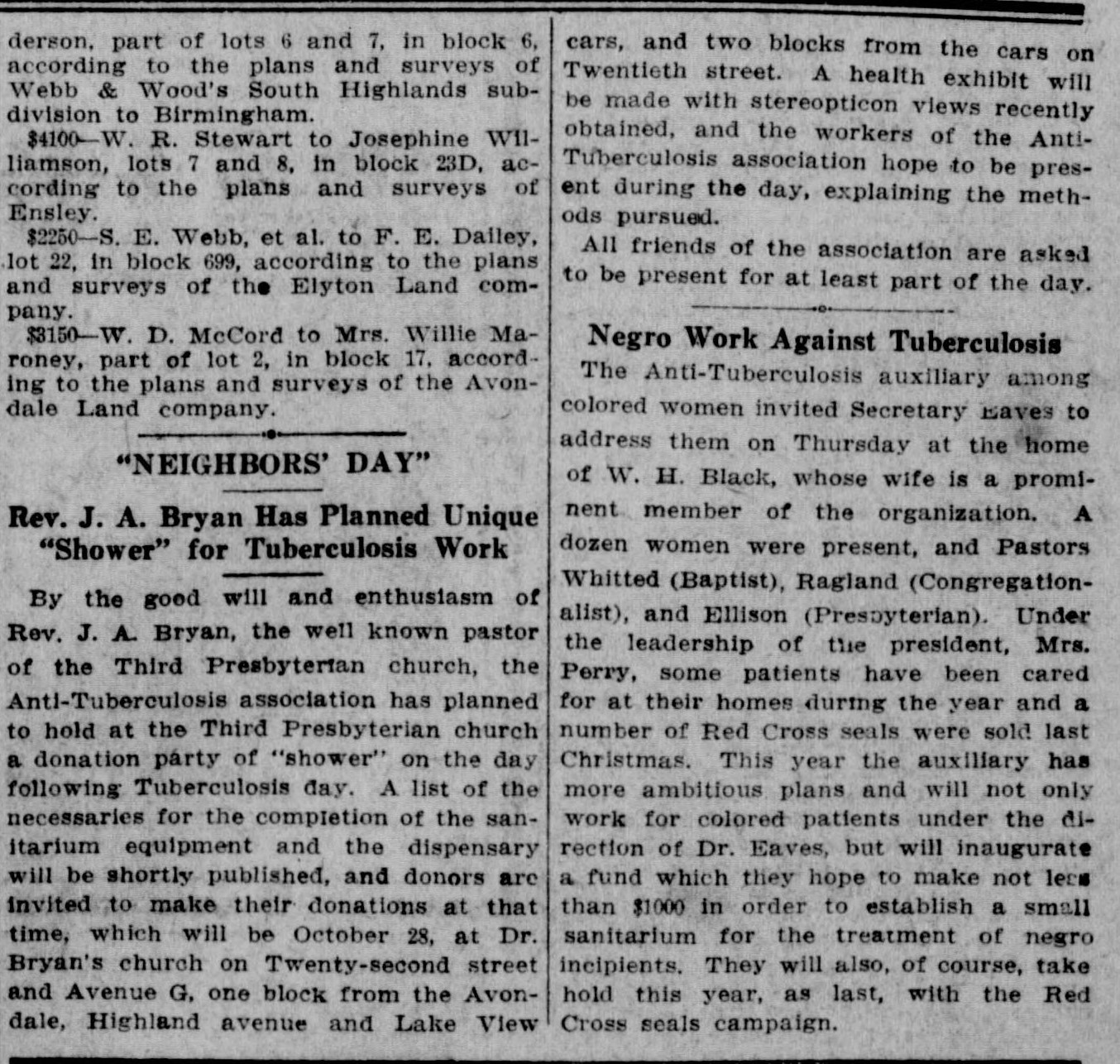 “Neighbors’ Day’-Rev. J.A. Bryan Has Planned Unique ‘shower’ for Tuberculosis Work” from Birmingham Age-Herald on 1912-10-20