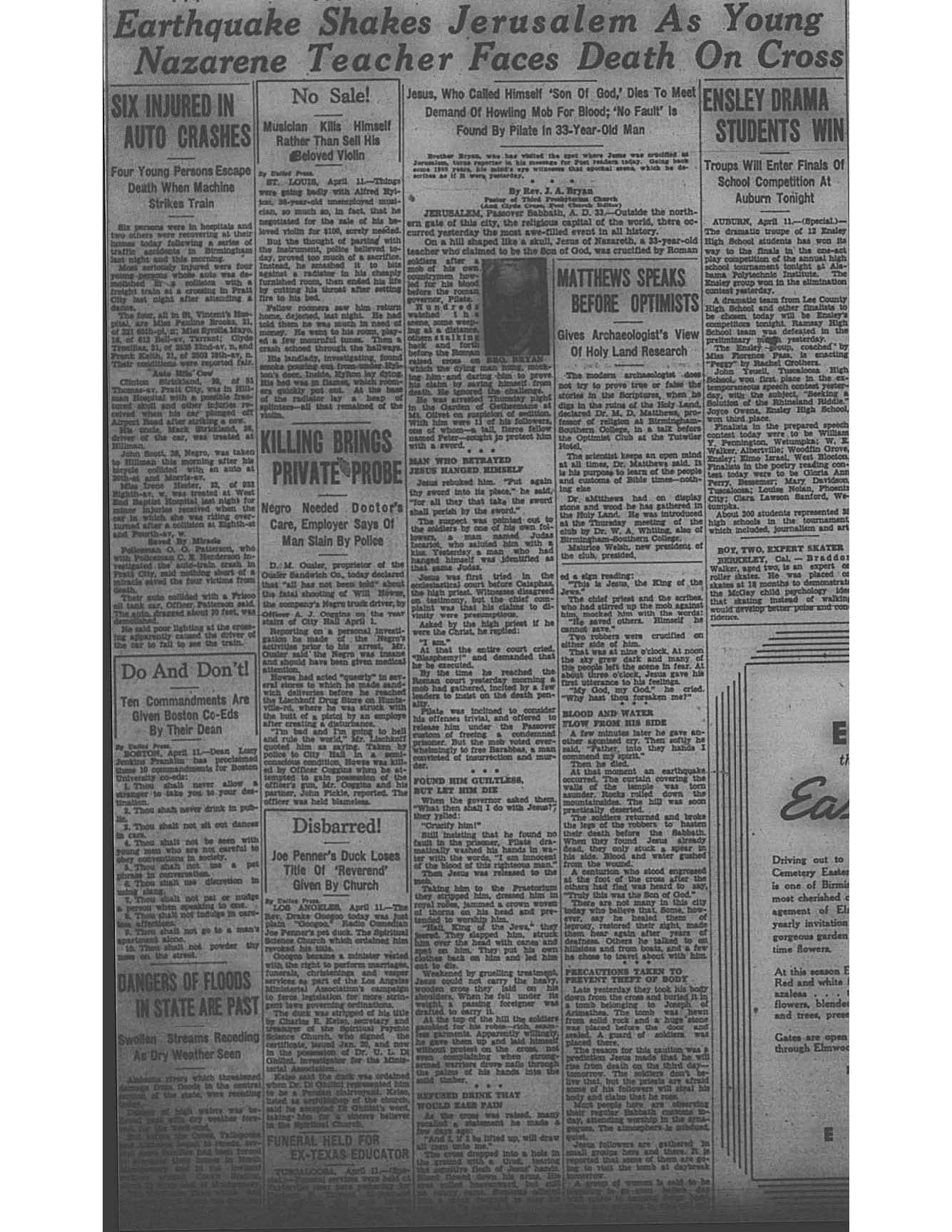 Birmingham Post-Herald | April 11, 1936 Earthquake Shakes Jerusalem As Young Nazarene Teacher Faces Death on Cross Notes:
