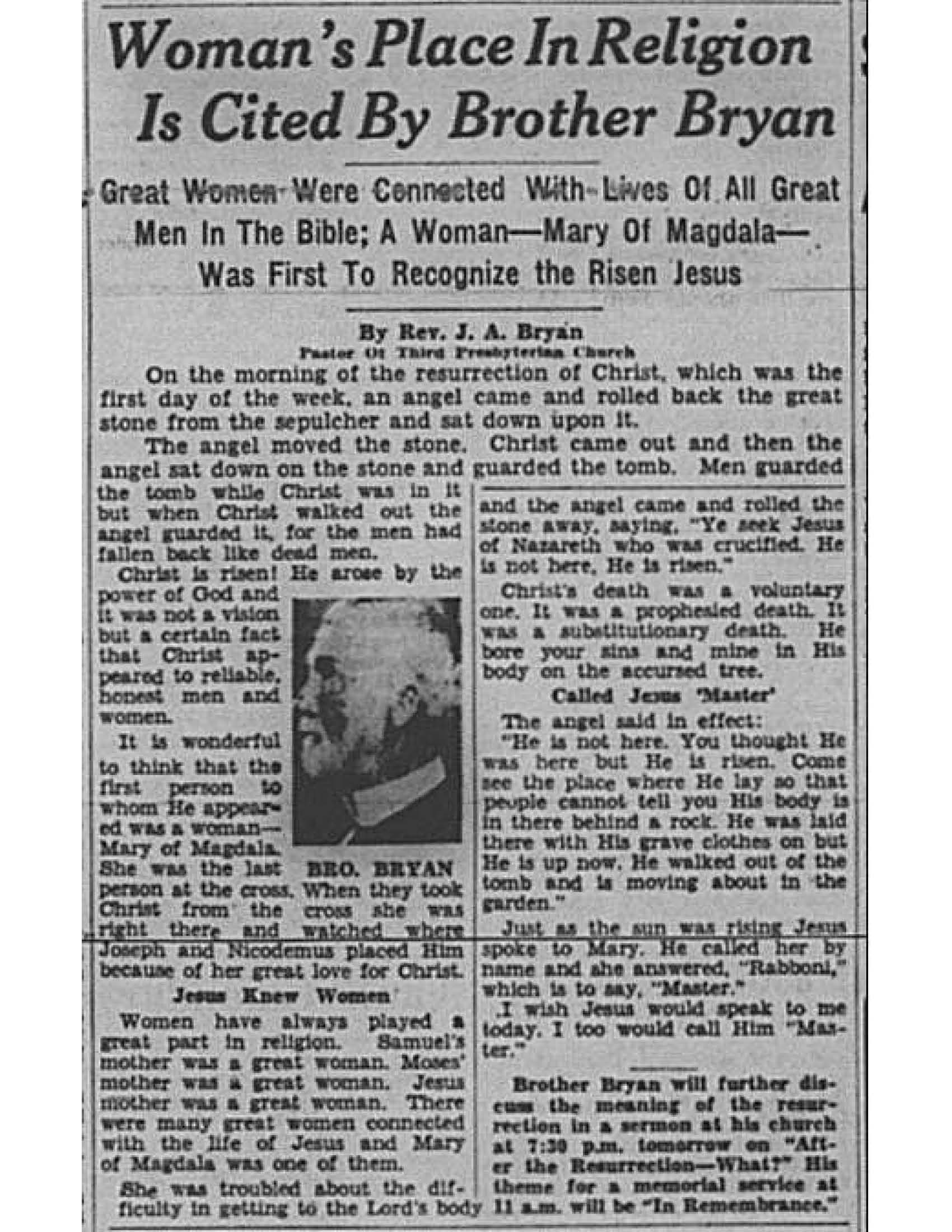 Birmingham Post-Herald | April 27, 1935 Woman’s Place In Religion Is Cited By Brother Bryan Notes: