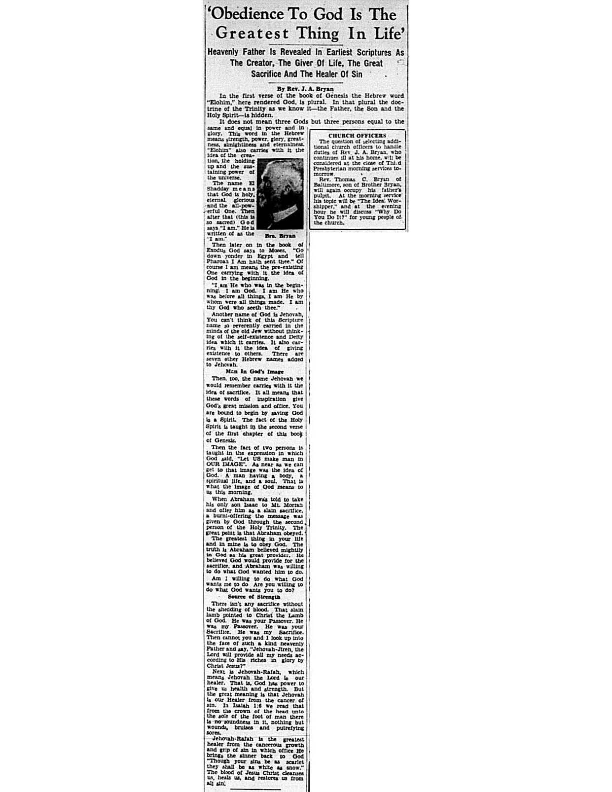 Birmingham Post-Herald | August 7, 1937 Obedience To God Is The Greatest Thing In Life’ Notes: Church officers looking for help
