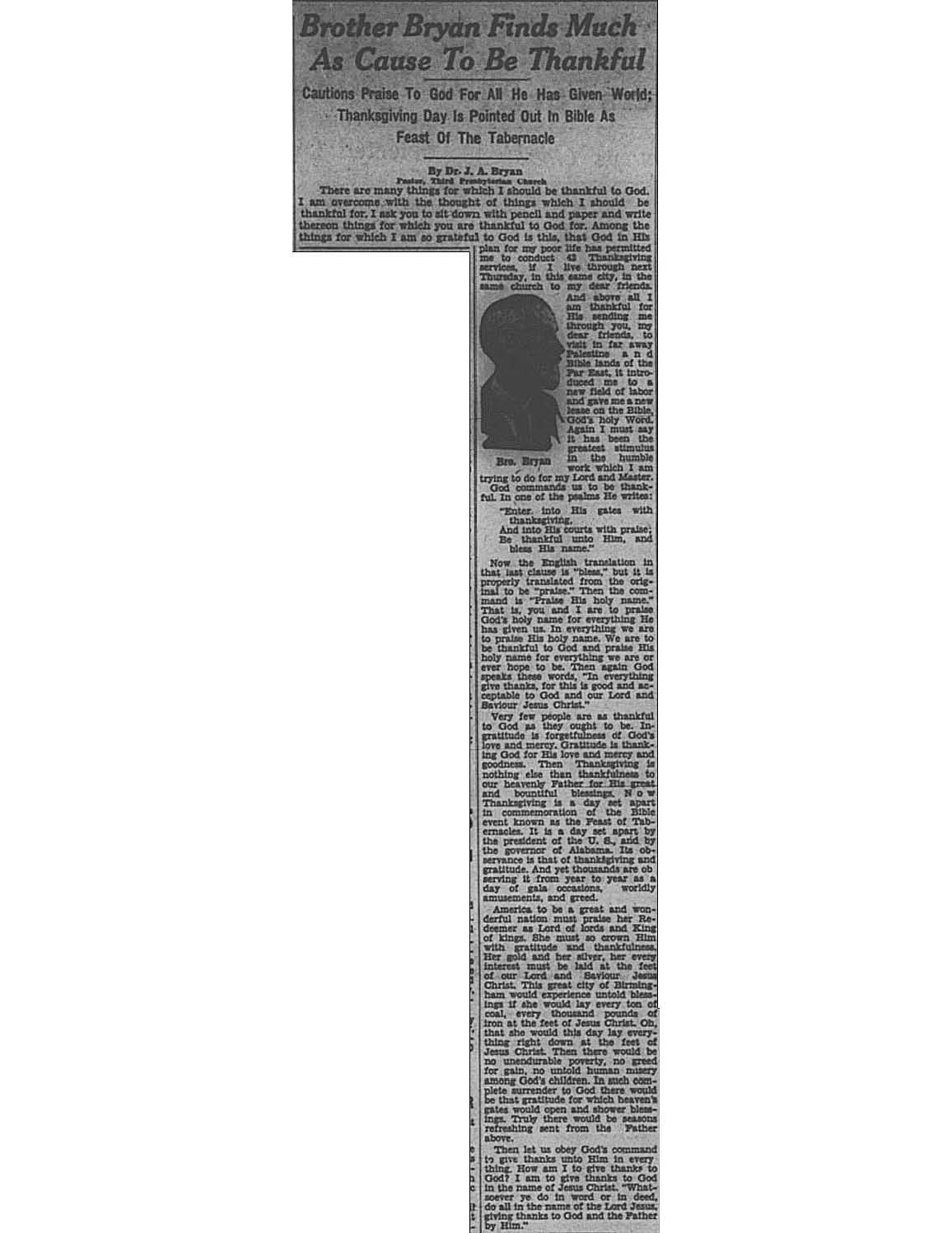 Birmingham Post-Herald | December 2, 1933 Brother Bryan Finds Much As Cause To Be Thankful Notes: