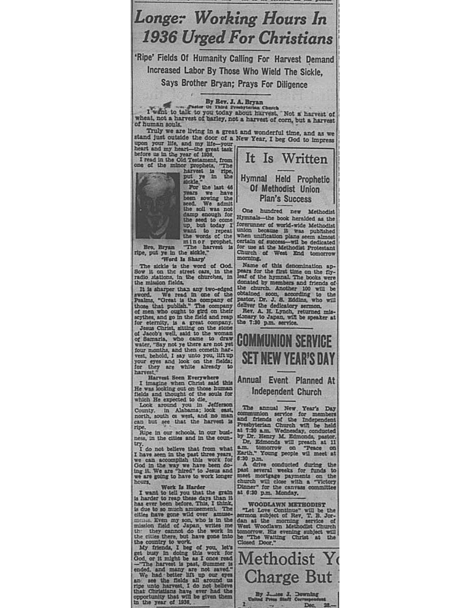 Birmingham Post-Herald | December 28, 1935 Longer Working Hours In 1936 Urged For Christians