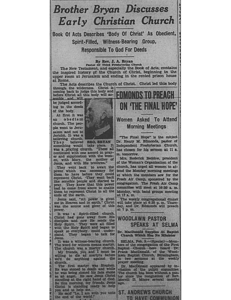Birmingham Post-Herald | February 9, 1935 Brother Bryan Discusses Early Christian Church