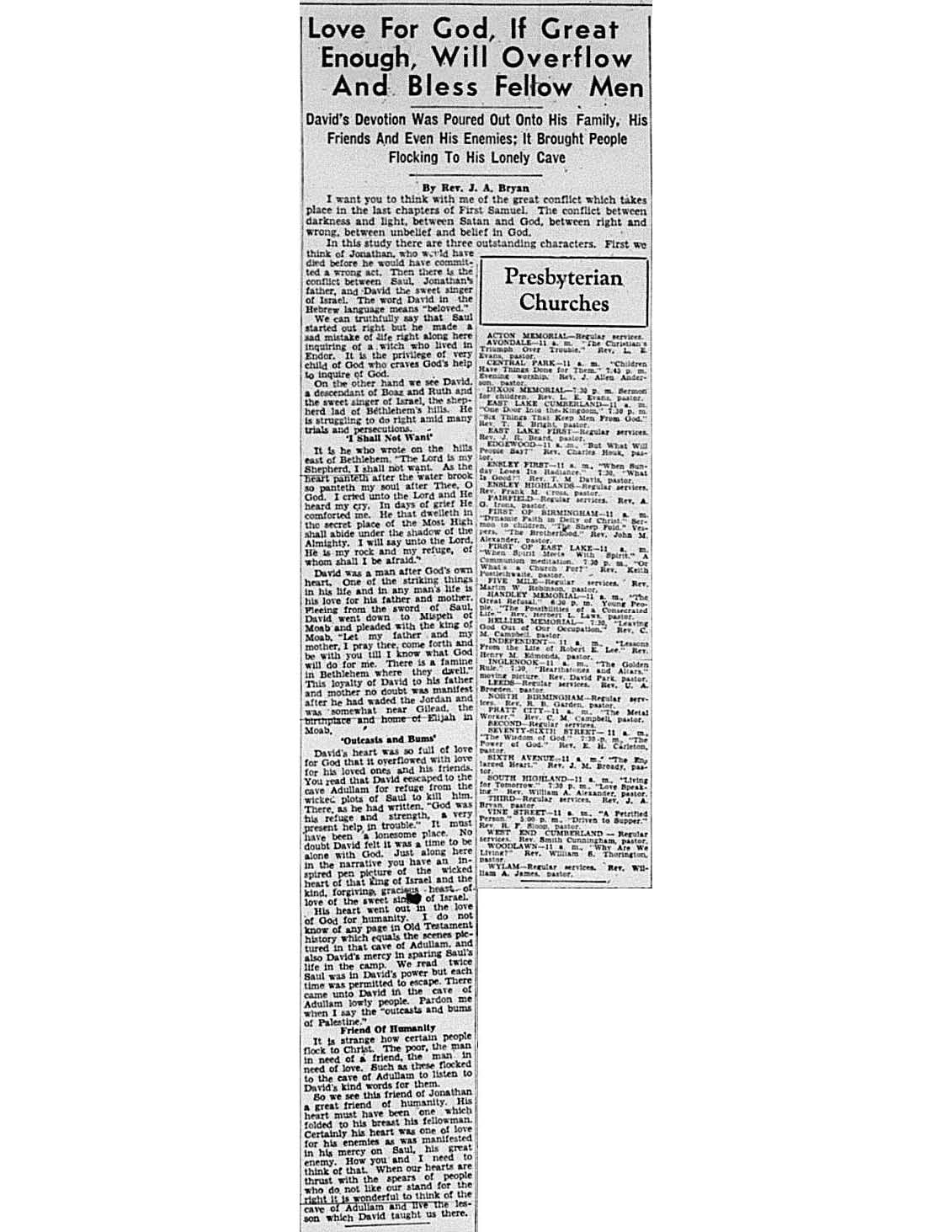 Birmingham Post-Herald | January 15, 1938 Love For God, If Great Enough, Will Overflow And Bless Fellow Men Notes: