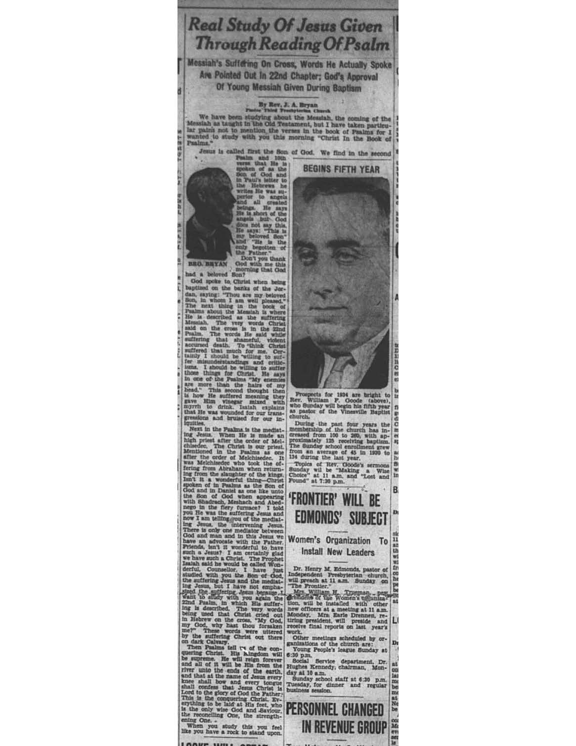 Birmingham Post-Herald | January 6, 1934 Real Study of Jesus Given Through Reading of Psalm Notes: