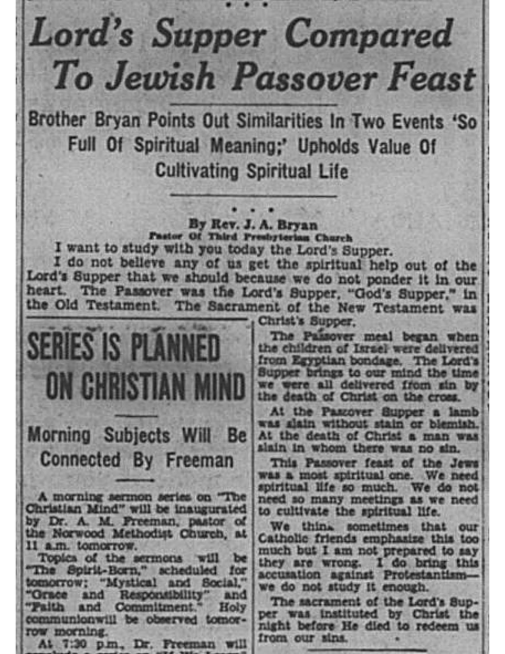 Birmingham Post-Herald | June 1, 1935 Lord’s Supper Compared To Jewish Passover Feast Notes: