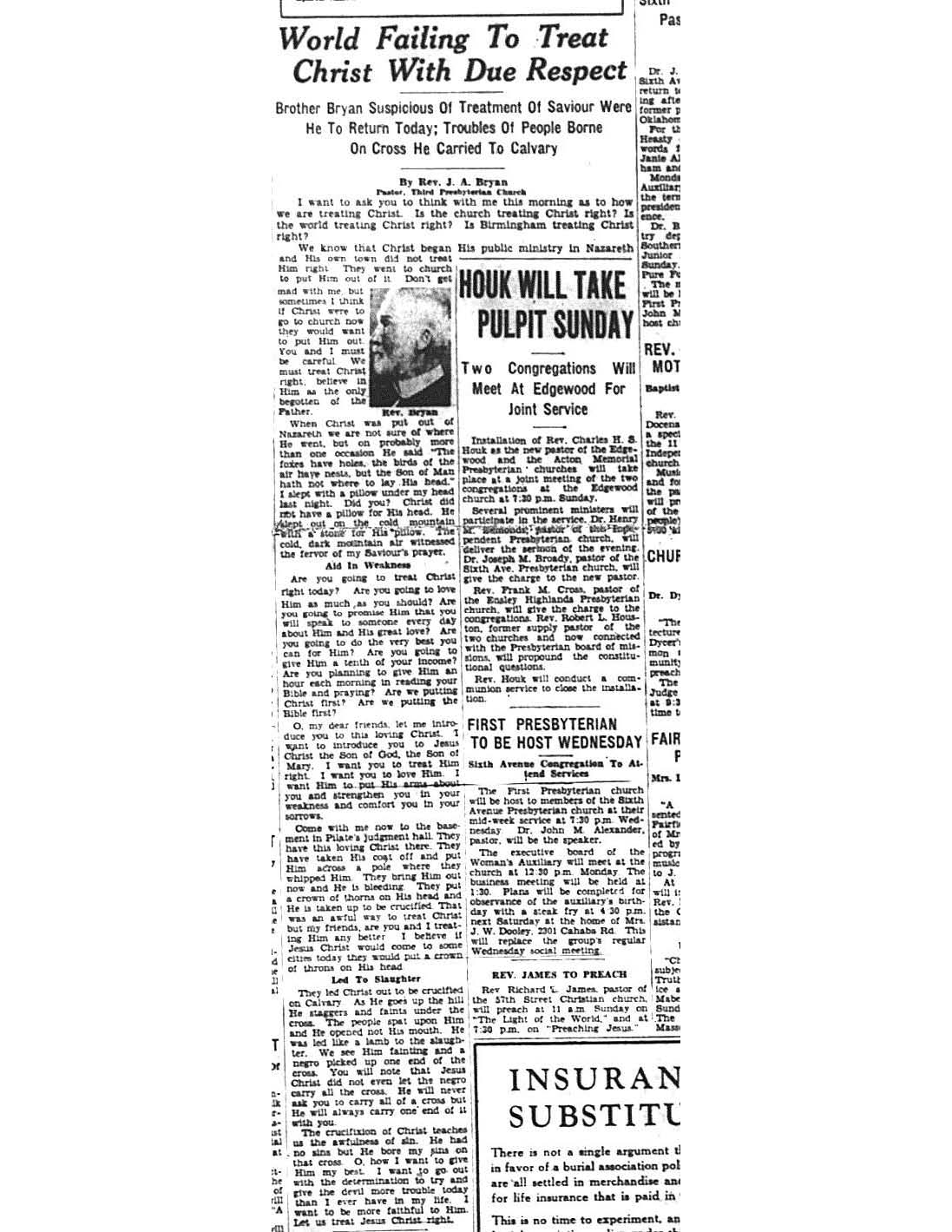Birmingham Post-Herald | May 12, 1934 World Failing To Treat Christ With Due Respect Notes: