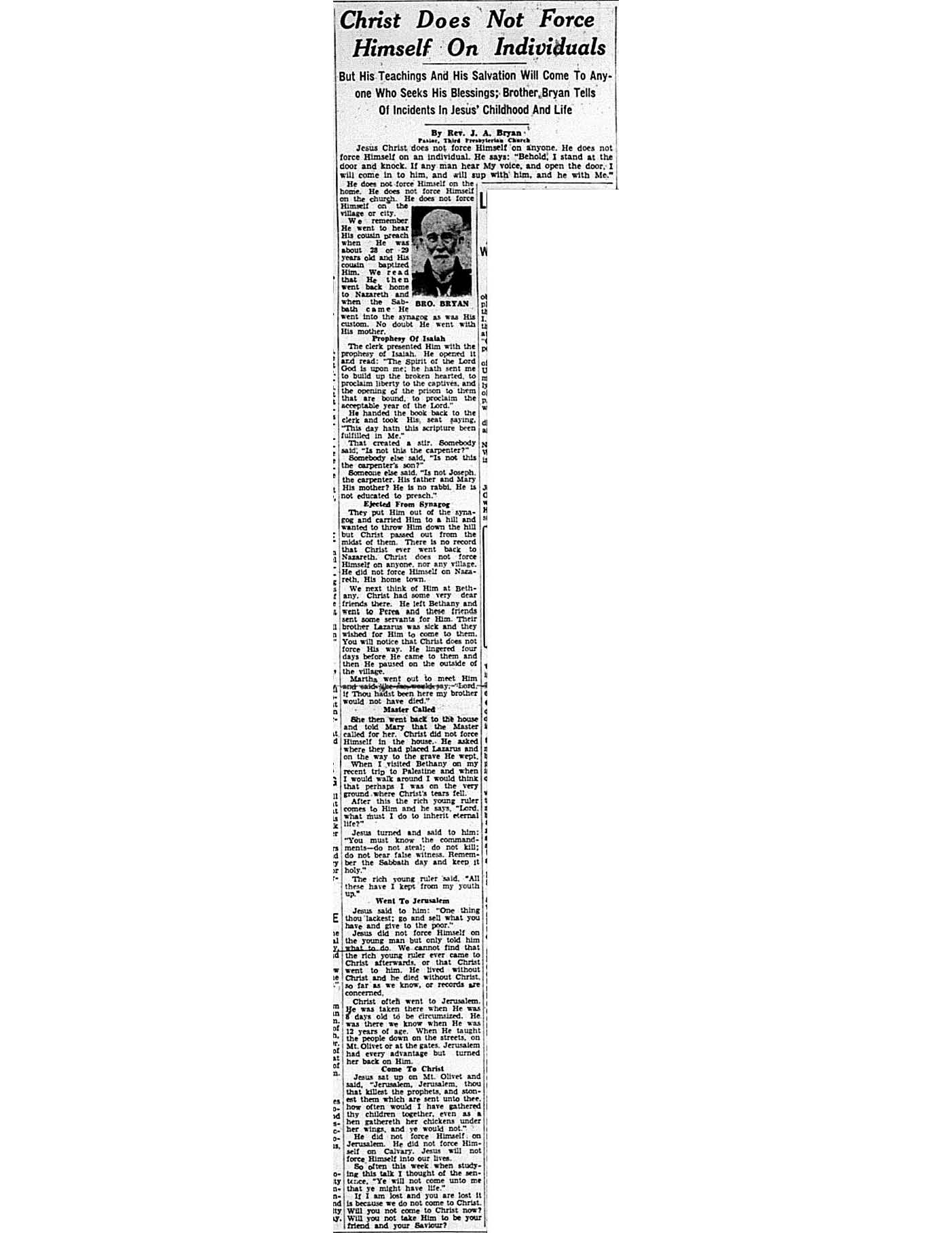 Birmingham Post-Herald | November 26, 1938 Christ Does Not Force Himself on Individuals Notes: