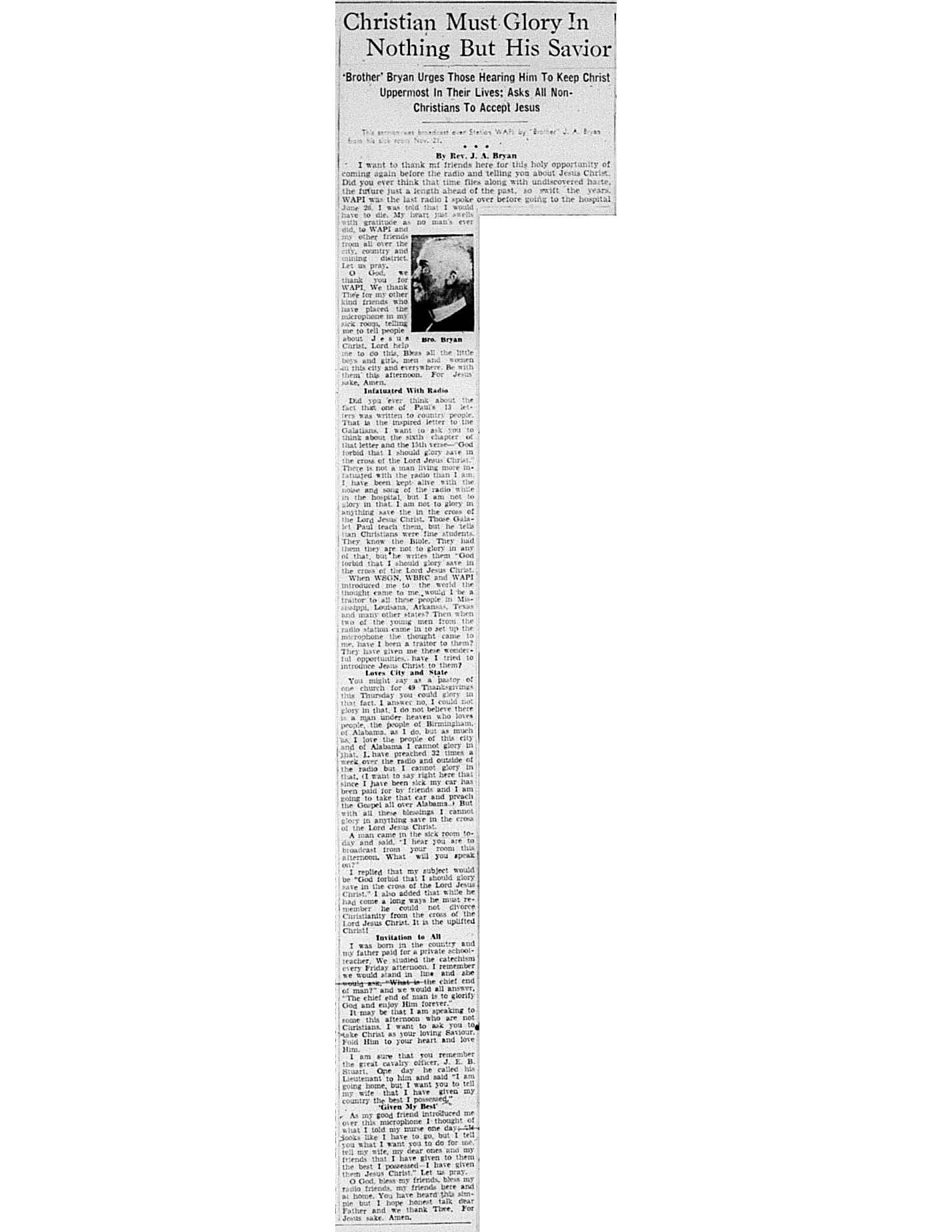 Birmingham Post-Herald | November 27, 1937 Christian Must Glory In Nothing But His Savior Notes: WAPI talk