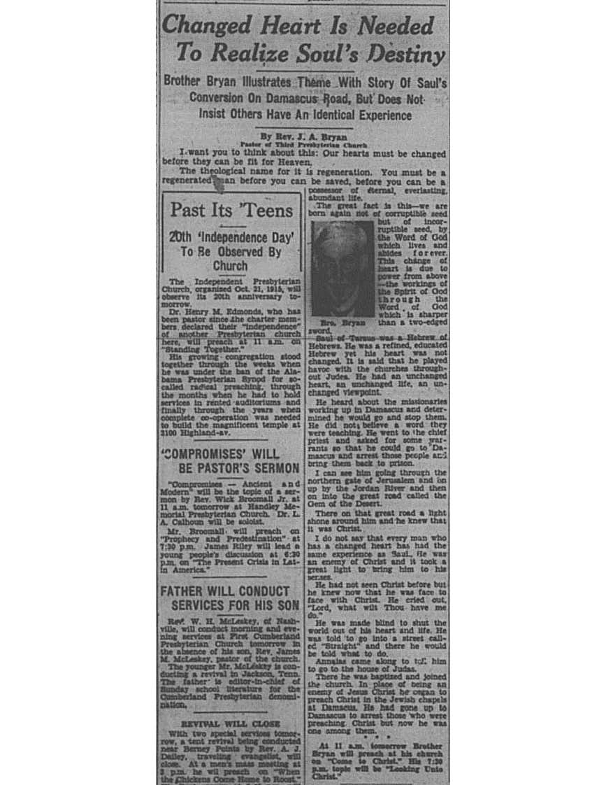 Birmingham Post-Herald | October 19, 1935 Changed Heart Is Needed To Realize Soul’s Destiny Notes: