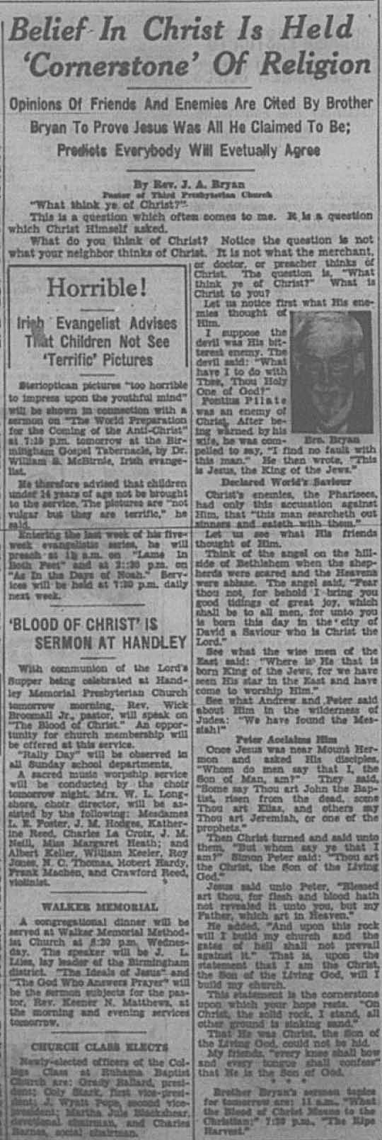 Birmingham Post-Herald | October 5, 1935 Belief In Christ Is Held ‘Cornerstone’ of Religion Notes: Check Response in letter to editor