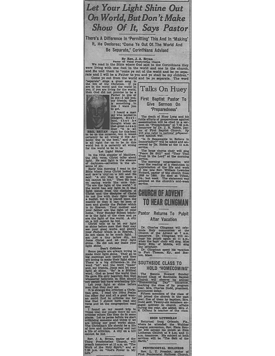 Birmingham Post-Herald | September 14, 1935 Let Your Light Shine Out On World, But Don’t Make Show of It Notes: