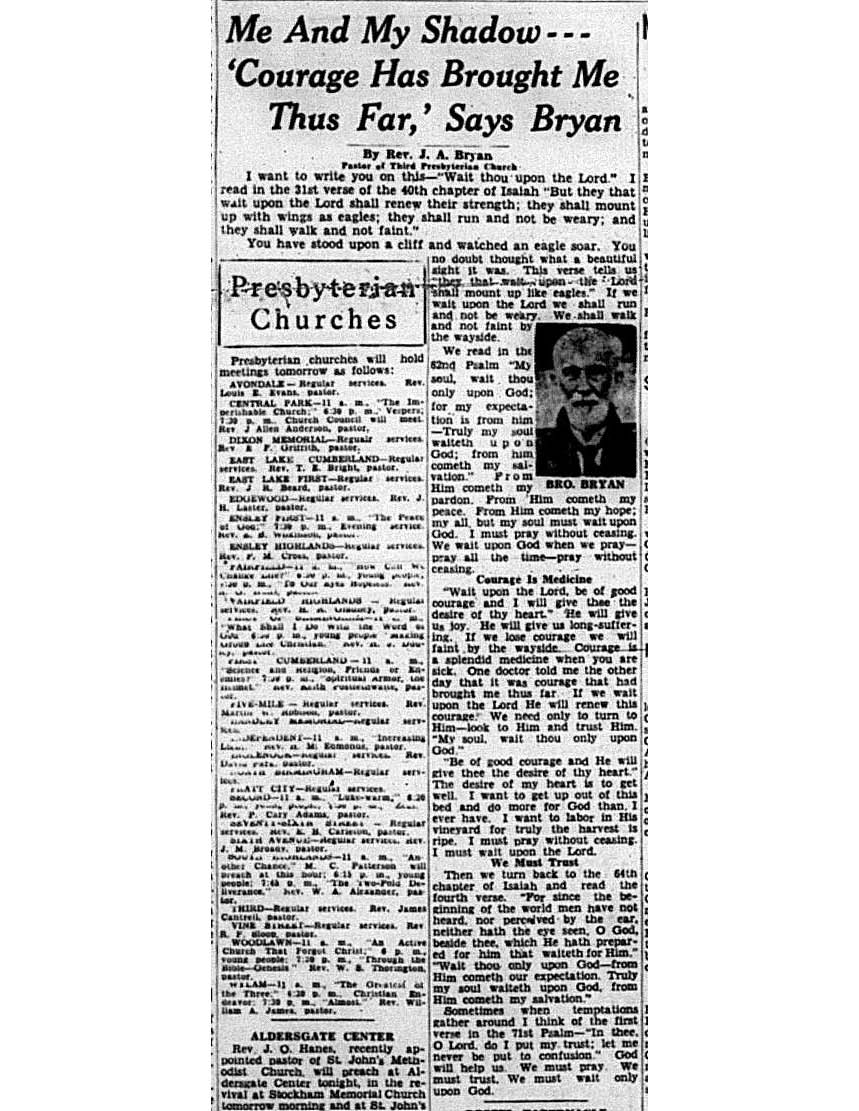 Birmingham Post-Herald | September 14, 1940 “Me And My Shadow–‘Courage Has Brought Me Thus Far,’ Says Bryan” Notes: