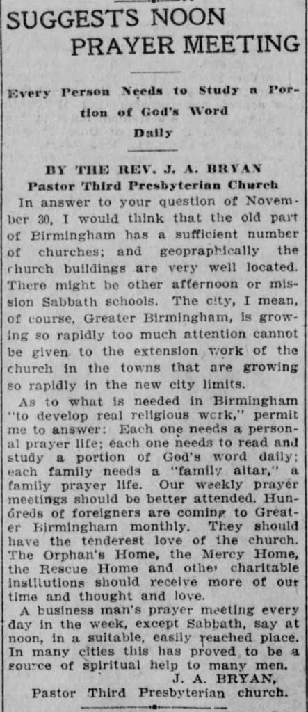 Suggests Noon Prayer Meeting — Bryan from the Birmingham Age-Herald on 1910-12-04